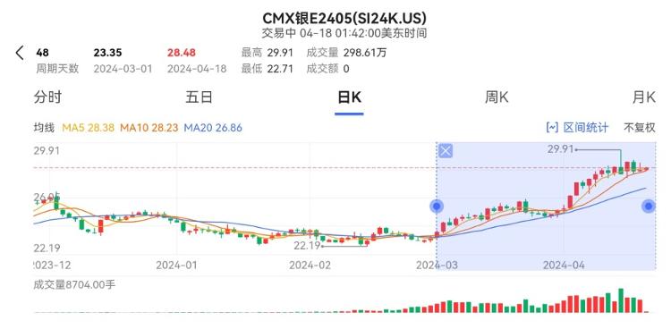 近期白银价钱抓续高涨,且创出3年以来新高,3月1日以来,纽约商品走动所白银价钱从每盎司22.71好意思元高涨到最高每盎司29.91好意思元,最高高涨幅度超越30%。相通3月1日以来,纽约商品走动所黄金价钱从每盎司2047好意思元高涨到最高每盎司2429好意思元,最高高涨幅度为18.67%。银价的涨幅如故超越金价。
