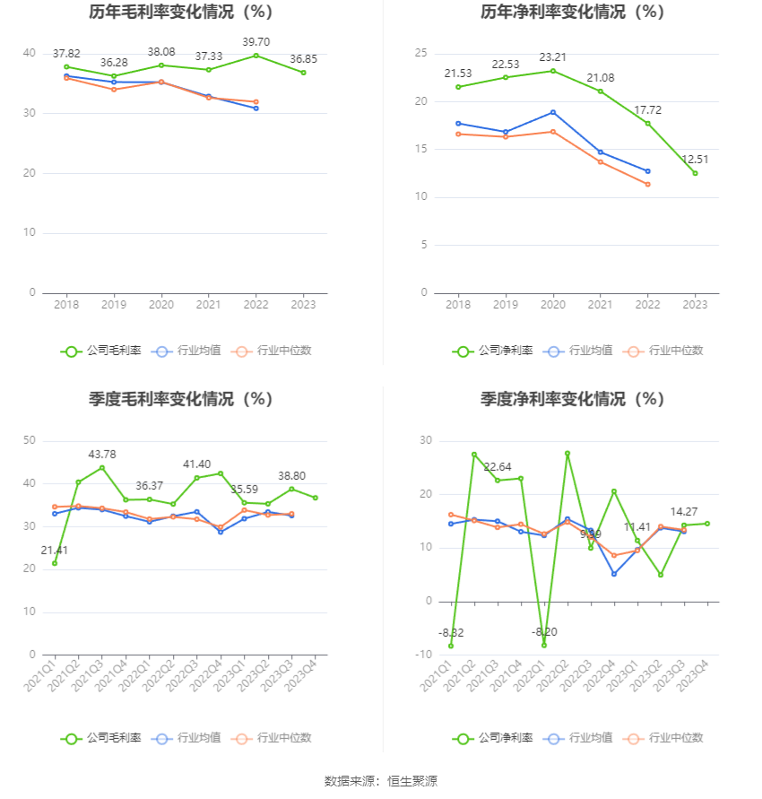 2023年,公司毛利率为36.85%,同比下落2.85个百分点;净利率为12.51%,较上年同时下落5.21个百分点。从单季度意见来看,2023年第四季度公司毛利率为36.74%,同比下落5.69个百分点,环比下落2.06个百分点;净利率为14.57%,较上年同时下落6.05个百分点,较上一季度飞腾0.30个百分点。