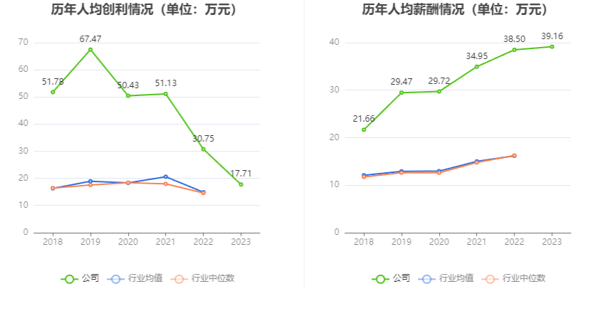 法例2023年末,公司职工总额为88东说念主,东说念主均创收141.62万元,东说念主均创利17.71万元,东说念主均薪酬39.16万元,较上年同时辰别变化-18.19%、-42.42%、1.72%。