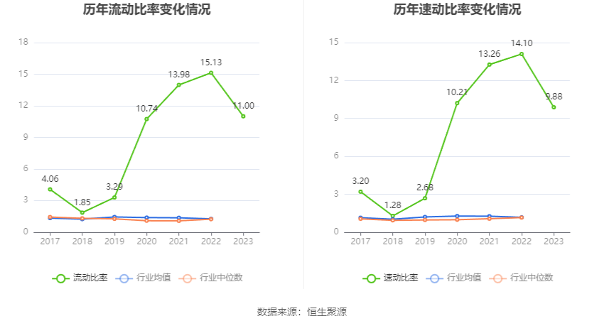 2023年,公司流动比率为11.00,速动比率为9.88。