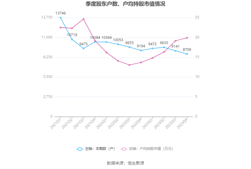 筹码聚首度方面,法例2023年年末,公司鼓吹总户数为8709户,较三季度末下落了432户,降幅4.73%;户均抓股市值由三季度末的19.15万元飞腾至19.91万元,增幅为3.97%。