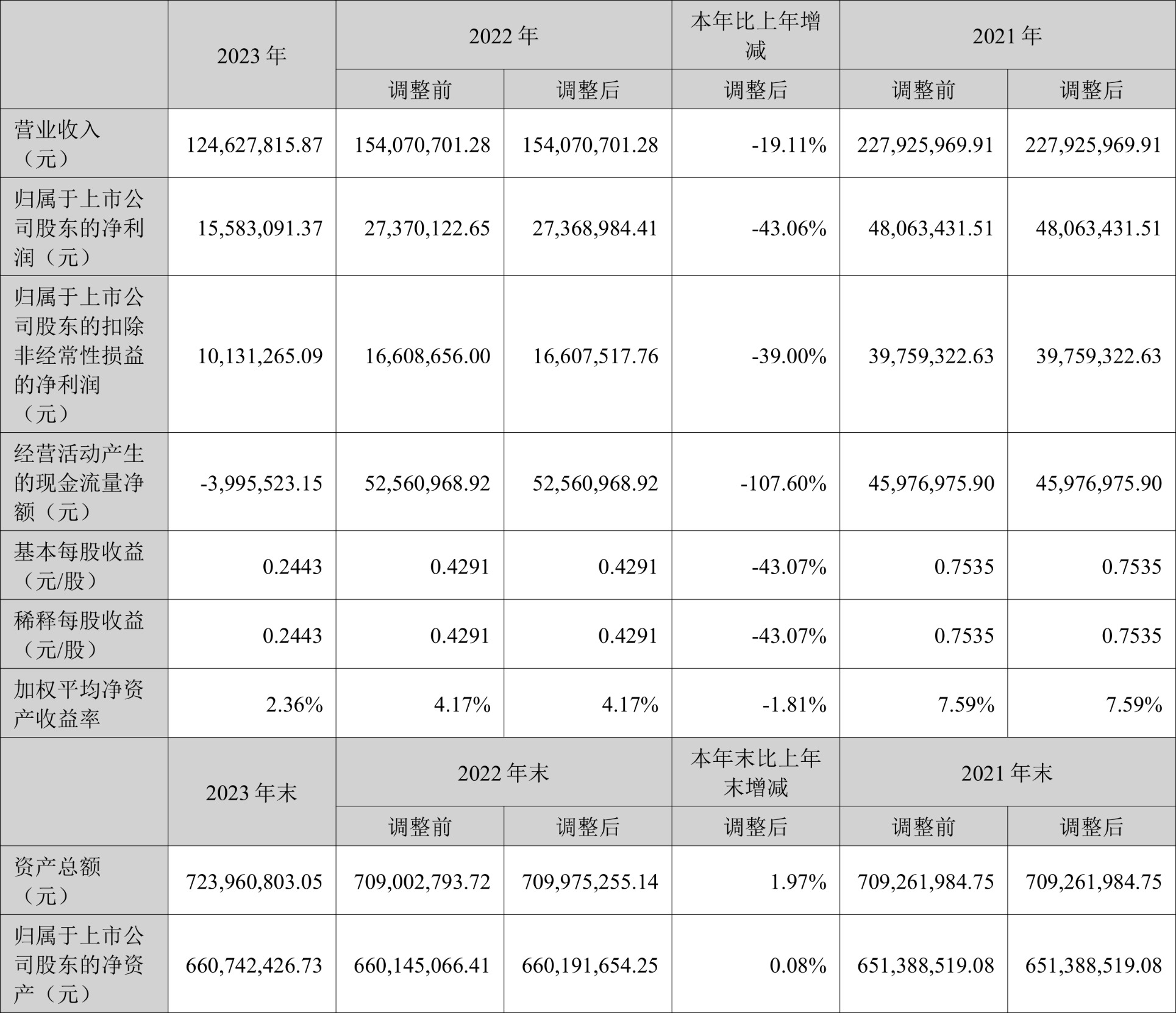 中证智能财讯上海凯鑫(300899)4月23日败露2023年年报。2023年,公司竣事贸易总收入1.25亿元,同比下落19.11%;归母净利润1558.31万元,同比下落43.06%;扣非净利润1013.13万元,同比下落39.00%;计算行径产生的现款流量净额为-399.55万元,上年同时为5256.10万元;敷陈期内,上海凯鑫基本每股收益为0.2443元,加权平均净钞票收益率为2.36%。